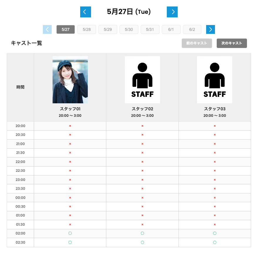 当プラグイン「WP Simple Schedule Manager」では、スタッフのスケジュール情報をWordPressサイト上にわかりやすく表示するために、テーマファイルのカスタマイズを通じて以下のように表示を実現しています。